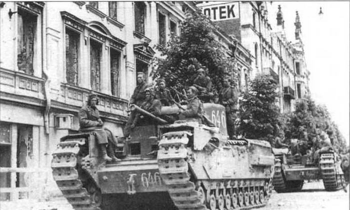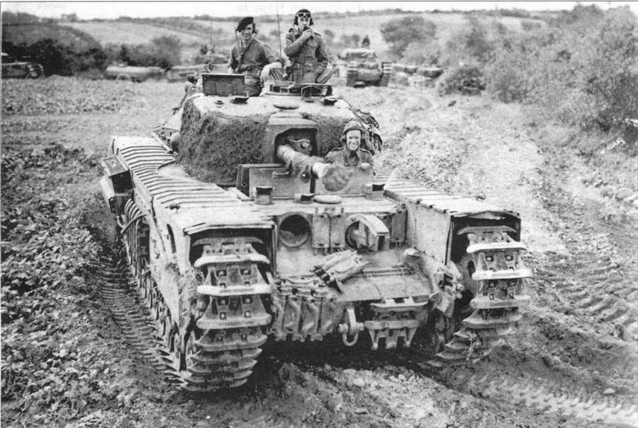 Во вторжении на Европейский континент летом 1944 года участвовали две танковые бригады: 34-я армейская (107-й, 147-й и 153-й полки Королевского танкового корпуса) и 6-я гвардейская армейская (4-й гренадерский, 4-й Колдстримский и 3-й Шотландский гвардейские батальоны[•Гвардейские батальоны соответствовали армейским полкам.]), вооруженные танками «Черчилль».