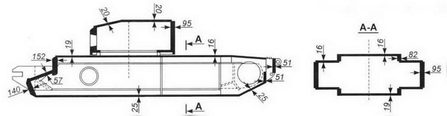 1. Броневой корпус несколько необычно удлинен и, соответственно, уменьшен по ширине и высоте. Носовая часть корпуса оказалась низкорасположенной между высокоподнимающимися гусеницами. которые закрыты большими грязевиками. Это создает плохую обзорность для водителя и стрелка. Перископические смотровые приборы, установленные около водителя и стрелка, обзорность увеличивают мало. При положении пушки по ходу танка обрез канала ствола не выходит за габариты грязевиков и находится между ними. Это приводит к тому, что при стрельбе из пушки в таком положении газовой волной срывает и ломает передние грязевики танка.
