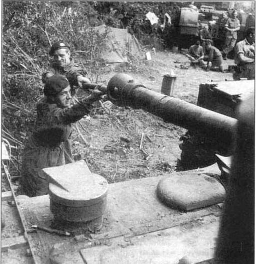 Танкисты 107-го полка Королевского танкового корпуса за чисткой 75-мм пушки танка «Черчилль». Нормандия, окрестности г. Кана, 17 июля 1944 года