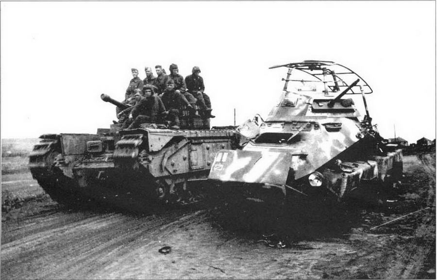 Этот «Черчилль III» получил попадание 88-мм немецкого снаряда. Мощная зенитная пушка Flak 18 была едва ли не единственным средством борьбы с английскими пехотными танками