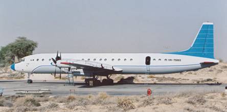 Казахстанским авиакомпаниям еще принадлежат несколько Ил-18 (снимок сделан в январе 2004 г. в Шардже)