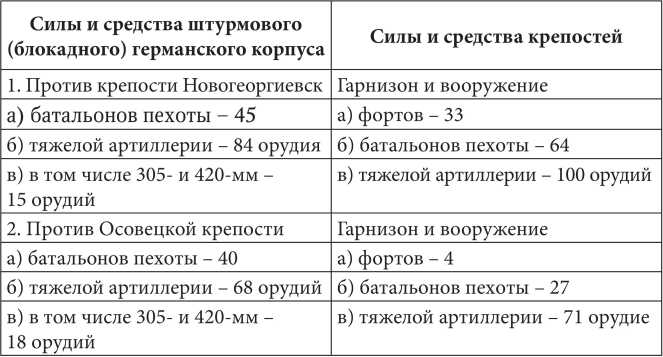 Сравнение немецких штурмовых сил и сил Новогеоргиевской и Осовецкой крепостей.