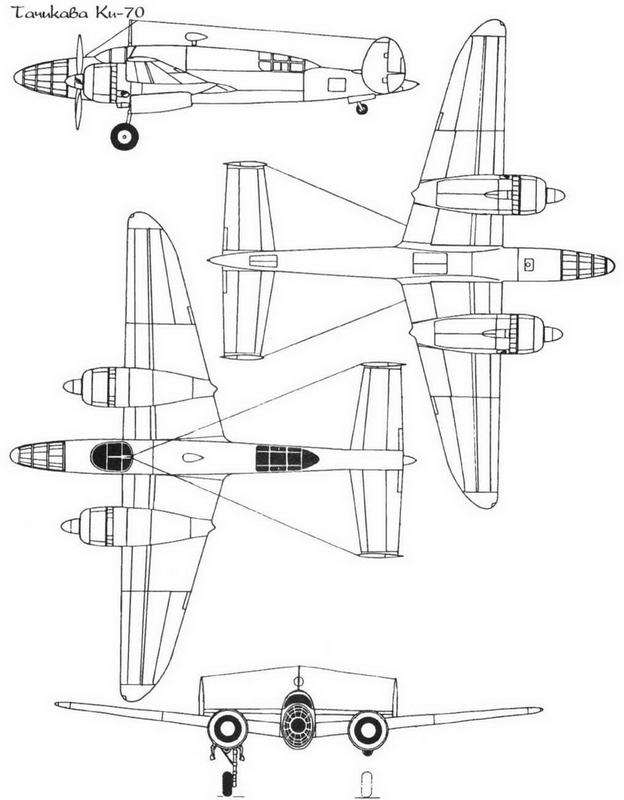 Разведчик Тачикава Ки-70 проектировался как замена Мицубиси Ки-46, но так и не дошел до серийного производства, показав летные данные ниже, чем у последних модификаций Ки-46. В марте 1939 г - еще за восемь месяцев до первого полета опытного Ки-46, воздушный штаб уже направил Тачикаве предложение спроектировать еще более скоростной дальний разведчик, получивший обозначение Ки-70. Тачикава разработала проект двухмоторного среднеплана цельнометаллической конструкции с крылом ламинарного профиля. Экипаж должен был состоять из трех человек. Наблюдатель размещался в носу и имел в своем распоряжении 7,7-мм пулемет, пилот сидел перед крылом, а в задней части фюзеляжа размещался радист с 12,7-мм пулеметом на подвижной установке. Для улучшения углов обстрела из заднего пулемета оперение было сделано двухкилевым. С 18-цилиндровыми двигателями воздушного охлаждения Мицубиси Ха-104М мощностью 1900 л.с. скорость ожидалась в 647 км/ч на высоте 5400 м.
