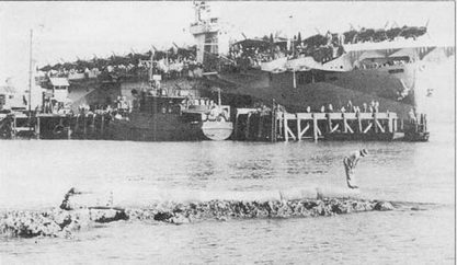 Американский эскортный авианосец перед отправкой из Сан-Франциско в южную часть Тихого океана. На палубу авианосца погружены истребители Р-38. Эскортные авианосцы широко использовались в качестве авиатранспортов.
