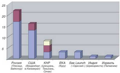 В 2004 г. пуски РН осуществлялись пятью странами и двумя международными компаниями. По-прежнему большинство запусков приходится на Россию и США, причем Россия вновь вышла на первое место. Правда, произошло это не за счет увеличения количества запускаемых в нашей стране ракет (оно практически не изменилось), а за счет значительного уменьшения числа пусков в США (с 23 до 16). Китай, занявший в 2003 г. третье место, уверенно удержал эту позицию и в минувшем году.