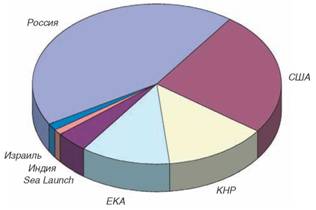 В 2004 г. бесспорным лидером по количеству запущенных КА продолжала оставаться Россия, хотя число выведенных на орбиту спутников и сократилось (с 40 до 33). В США уменьшение числа запущенных КА оказалось еще более существенным (с 26 до 19), что и не позволило изменить соотношение. Число КА, запущенных в Китае и компанией Arianespace, осталось приблизительно на уровне предыдущего года. Во всех остальных случаях речь идет о единичных пусках, которые не позволяют выявить тенденции и поэтому не анализируются.