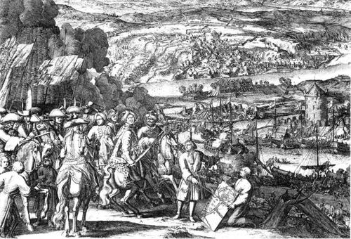 Осада турецкой крепости Азов в 1696 году русскими войсками. Гравюра, исполненная в 1699 г. А. Шхонебеком в Москве под личным наблюдением Петра I. (ГИМ).