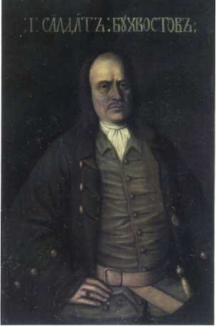 Первый российский солдат Сергей Леонтьевич Бухвостов. Портрет кисти неизвестного художника. 1720-е гг. (ГРМ). В 1683 г. стряпчий конюх С.Л. Бухвостов (1642–1728) был первым зачислен в потешные войска юного Петра I, при котором находился в разных военных походах. В 1696 г., являясь капралам Преображенских бомбардиров, служил в 3-й роте Морского регимента и участвовал в осаде Азова. 7 мая 1703 г. был на абордаже двух шведских судов в устье Невы.