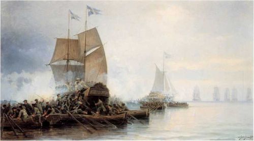 Абордаж русскими гвардейцами шведских галиота «Гедан» и шнявы «Астрильд» в устье Невы 7 мая 1703 г. Копия Л.Д. Блинова 1890 г. с картины художника А.П. Боголюбова 1865 г. (ЦВММ).