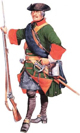 Фузелер Морского полка. 1706–1708 гг. Компьютерная графика В.А. Передерия по рисунку художника Н.В. Зубкова. 1995 г. (Рисунок предоставлен военно-историческим журналом «Цейхгауз»).