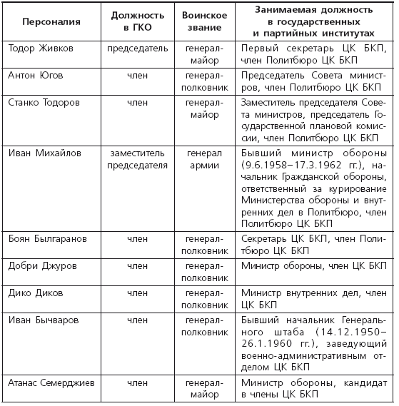 Эти события серьезно отразились и на кадровом составе высших органов государственной власти, а также военного управления. Одним из результатов внутрипартийной борьбы и победы в ней Т. Живкова стало снятие осенью 1962 г. со своего поста премьера А. Югова, место которого занял сам глава БКП, а после апреля 1965 г. – изменения в персональном составе Государственного комитета обороны, из которого был исключен генерал-полковник И. Бычваров, смещённый в начале октября 1965 г. со своего поста заведующего административным отделом, и введены новые члены – заместитель председателя Совета министров член Политбюро ЦК БКП Ж. Живков, ближайший сподвижник Т. Живкова кандидат в члены Политбюро ЦК БКП, секретарь ЦК БКП П. Кубадински, новый заведующий административным отделом ЦК БКП, член ЦК БКП генерал-лейтенант А. Цанев и председатель созданного в начале июля 1965 Комитета государственной безопасности (ДС), член ЦК БКП генерал-майор А. Цолаков[307].