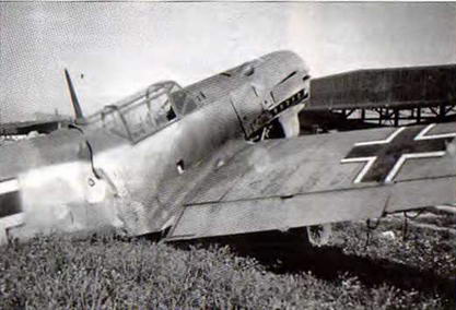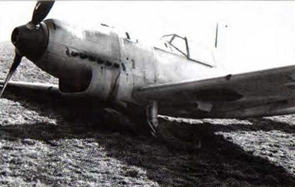 Одним из недостатков Bf 109 являлся неравномерный срыв потока на крыле. Особенно это сказывалось на посадке на малых скоростях, когда одна консоль неожиданно "проваливалась". При этом возникало скольжение, следовал не только вертикальный, но и боковой удар о землю стойкой шасси. Отсутствие подкоса приводило к тому, что стойка тут же подламывалась. Подобное происходило и на пробеге в случае резкого разворота самолета (на этих снимках запечатлены истребители вариантов В, С и D. Машины разные, но сколь одинаков характер повреждений: разбитая законцовка крыла и вывернутая внутрь стойка)
