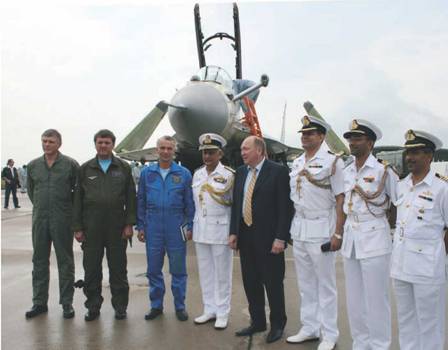 После демонстрационного полета 27 июня, слева направо: летчики-испытатели Олег Антонович и Николай Диордица (второй пилот и командир экипажа МиГ-29КУБ), Павел Власов (пилотировал МиГ-29К), начальник штаба авиации ВМС Индии генерал Верма, генеральный директор – генеральный конструктор РСК «МиГ» Алексей Федоров и представители индийской морской авиации