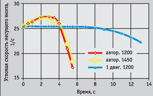 Был сделан расчет посадки на режиме авторотации вертолета, у которого момент инерции винта увеличен до 1450 кгм/с2, то есть на 20 %.