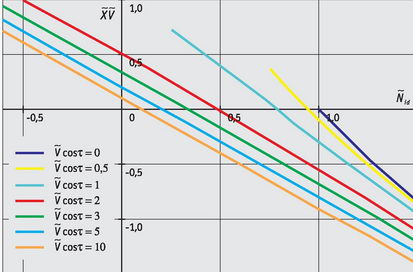 Коэффициент ηв находится не по формуле (13), а следующим образом. Определенная в летных испытаниях или по расчету зависимость GVyg=ƒ(Nдв) на установившемся прямолинейном полете при G=const, Vcosα=const и ωR=const линеаризуется, то есть максимально близко к экспериментальным или расчетным точкам проводится прямая линия (нетрудно показать, что точки располагаются близко к прямым). Эта зависимость определяется не при V=const, а при Vcosα=const, чтобы охватить все возможные траектории с любыми углами θ. Так, в полете вертолета по вертикали, когда 0~α=±90°, точки с разными V ложатся на кривую с Vcosα=const=0. Коэффициент ηв равен тангенсу угла наклона прямой. По этой зависимости находится также Nдв.г. п.