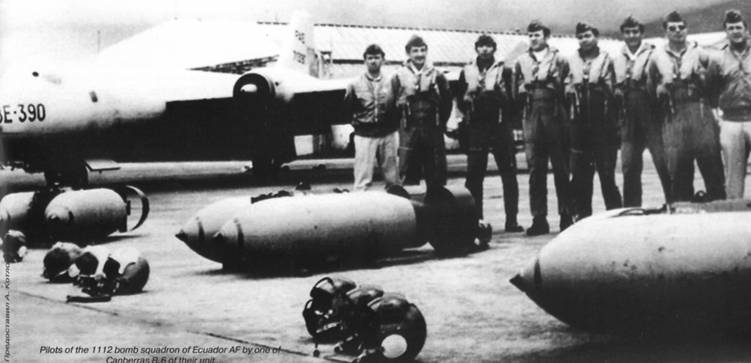 Летчики 1112-й бомбардировочной эскадрильи ВВС Эквадора возле одной из «Канберр» В.6 своей части