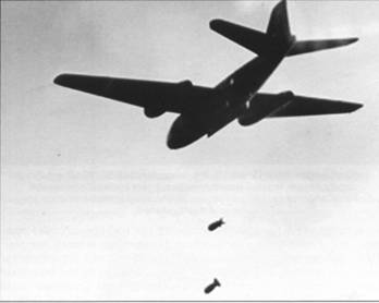 «Канберра» В.2 из 5-й эскадрильи ВВС Южной Родезии бомбит лагерь партизан (предположительно)