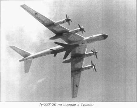 Тем не менее опыт был признан полезным. Мощность БЧ позволяла надеяться на потопление ближайших целей и при километровых промахах, а на прочих кораблях взрывом выводились из строя экипаж, радиотехнические системы, средства связи и управления, после чего разгром ослабленной группировки довершали ракетоносцы Ту-16, подлодки и корабли флота. Эксплуатация К-20 в строевых частях ВВС началась в августе 1959 года, когда первые ракетоносцы поступили в 1006-й ТБАП в Узине под Киевом. К концу года Ту-95К получили 1226-й ТБАП в Семипалатинске, а затем и 182-й гв.ТБАП в Моздоке. 14 февраля 1963 года в Узин прибыл первый Ту-95КМ. Узинские самолеты в июле 1961 года были привлечены к участию в воздушном параде в Тушино. 16 ракетоносцев зримым воплощением мощи ВВС прошли над аэродромом, неся Х-20М, выкрашенные в броский красный цвет. Хотя показ и был публичным, присутствовавшие на нем западные наблюдатели сумели ввести себя в заблуждение, сочтя прикрывавшие воздухозаборники ракет обтекатели за их головки самонаведения, из-за чего на протяжении ряда лет утвердилось мнение, что Х-20М управляются радиолокационной или, на худой конец, инер-циальной системой. Сами ракеты считались созданными на базе МиГ-19, а «наиболее продвинутые» эксперты объявляли их «беспилотным вариантом Су-7».