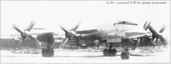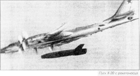 Летом 1957 года начали испытания самолетов-снарядов Х-20. Они продолжались с 6 июня 1957 года по 29 июля 1958 года. От ОКБ-155 всеми испытаниями по беспилотной тематике руководил П.А.Шустер. При обработке данных, решении вопросов динамики и траектории использовалась первая в стране БЭСМ-1, находившаяся в Институте точной механики АН СССР, а весной 1959 года первая такая вычислительная машина появилась и в лаборатории ОКБ. Испытания Х-20 шли удовлетворительно, без существенных дефектов системы. Вместе с тем имелись претензии к дальности и точности: в первом пуске 17 марта 1958 года ракета не вышла на маршевую траекторию из-за неисправности ПВД и отказа статоскопа - прибора, выдерживающего заданную высоту, не была достигнута и установленная дальность. В апреле был произведен следующий пуск, а в июле - еще два, после чего последовало решение о передаче комплекса К-20 на госиспытания. Летом 1958 года Ту-95К и Х-20 демонстрировали Н.С.Хрущеву, посетившему ЛИИ. Глава государства благосклонно оценил увиденное, что было немаловажно для судьбы проекта (для ОКБ-23 Мяси-щева такой визит завершился скорым расформированием).