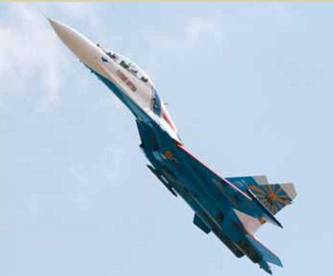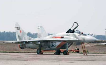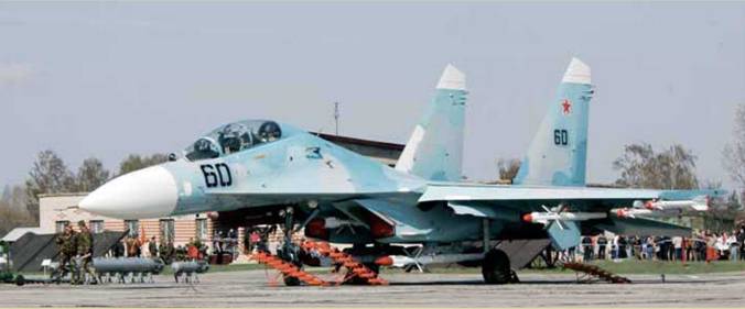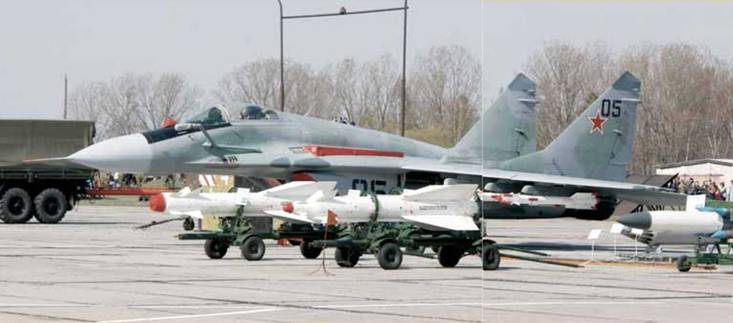 Слева и слева в середине: модернизированные истребители МиГ-29БМ, состоящие на вооружении 61 ИАБ с 2004 г. Самолеты могут оснащаться внушительным арсеналом высокоточного оружия (на тележках перед МиГ-29БМ №05 видны ракеты Х-29Т, Х-29Л и Х-31П). Одно из заметных внешних отличий – съемная штанга дозаправки