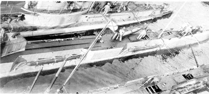 Подводные лодки: “Нерпа” (вверху) и “Морж” в 1916 г. после возвращения в Севастополь из 15-суточного боевого похода (внизу)