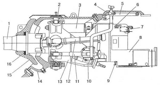 II — поворотный механизм; 12 — прицел TШ- 19; 13 — рама; 14 — кожух рамы; 15 — щит; 16 — амортизатор.