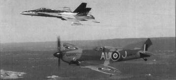 Канадский "Спитфайр" в сопровождении современного реактивного истребителя- бомбардировщика CF-18
