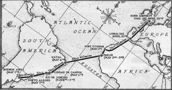 Правда, «Йорк» задержался на пять часов в Касабланке из-за плохой погоды. Ничего, зато все 8 ч 50 мин перелета через Атлантику пришлись на светлое время суток. Я летел за «Йорком», экипаж которого оказался очень хорошей компанией. Штурман никогда не отказывал мне в просьбах по поводу уточнения реальной точки места. Погода стояла отличная, без обычных для Атлантики фронтов, и мы благополучно сели в Но тале. Утром, в 8 ч 45 мин местного времени, я взлетел и взял курс но Рио-де-Жанейро Погода – чудо, но на подходе к Рио внизу ничего кроме плотной облачности не было видно. Я выполнил несколько заходов, снижаясь до высоты 500 футов (150 м), но так и не смог пробить облачность. Пришлось садиться в Сие- дад-Кампосе, расположенном в 150 милях северо-восточнее Рио, – это лишний час полета.