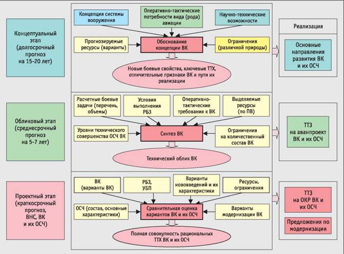 Формирование ВК выполняется на трех этапах военно-научных исследований: концептуальном (этапе обоснования концепций перспективных образцов, определяющих главную идею ВК в системе вооружения определенного рода авиации), обликовом (этапе синтеза ВК, оптимизации его основных ТТХ, конструктивноаэродинамической схемы и основных технических параметров), проектном (этапе уточнения отдельных ТТХ, принятых к реализации на этапе проектирования). Последовательность выполнения работ наглядно показана на рис. 1.
