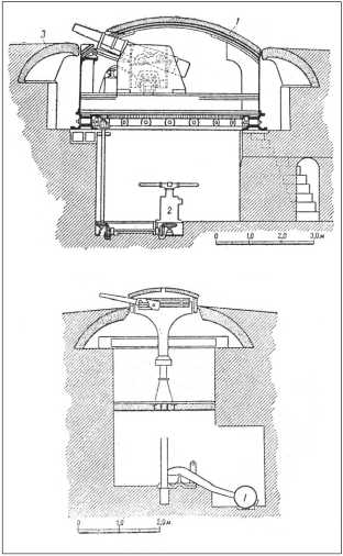Броневые башни системы Грюзона для сухопутных крепостей: вверху — башня на роликовом погоне для крупнокалиберного орудия, внизу — скрывающаяся башня для малокалиберного орудия на штыревой установке.