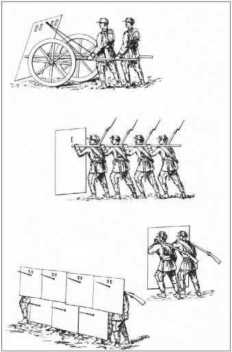 Броневые щиты Л. Нобеля толщиной 6,6 мм «для защиты от ружейных пуль», способы их передвижения и переноски, 1878 г.