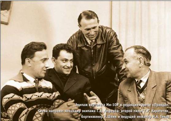 Экипаж вертолета Ми-10Р в редакции газеты "Правда". Слева направо: командир экипажа Г.в. Алферов, второй пилот г.р. карапетян, бортинженер К.Шеин и ведущий инженер Н.А.Генов