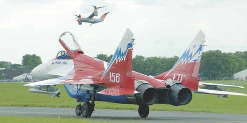 В летной части салона нашу страну представлял единственный летательный аппарат, зато какой! МиГ-29М-ОВТ под управлением Михаила Беляева творил в парижском небе чудеса сверхманевренного пилотажа. Поэтому неудивительно, что его выступление организаторы ставили в ежедневную программу полетов последним. На фоне «МиГа» полеты участвовавших в нынешнем салоне F-16, F/A-18F, «Рафаля» и «Еврофайтера» выглядели гораздо более бледными. К сожалению, Беляеву не удалось порадовать своим показом более широкую публику: во время очередного полета в пятницу один из двигателей истребителя дал кратковременный сбой. И хотя устойчивая работа силовой установки «МиГа» почти сразу же восстановилась, профессиональный испытатель решил полет прекратить, и в выходные микояновцы рисковать не стали. Но первые и главные рабочие дни нынешнего Ле-Бурже прошли под знаком именно российского МиГ-29М-ОВТ. Полетал в парижском небе и впервые участвующий в салоне Ан-148.