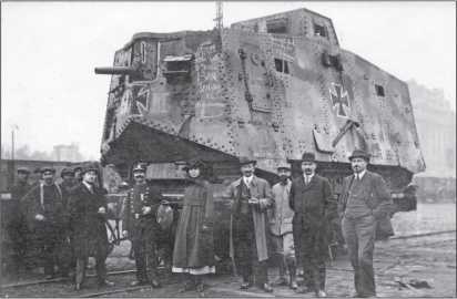 Трофейный танк A7V «Эльфриде» доставили со стрельбища Буррон в Париж для показа на выставке трофеев, октябрь 1918 г. Обратим внимание на вырезанный кусок брони в лобовой части корпуса справа — его оставили для баллистических испытаний.