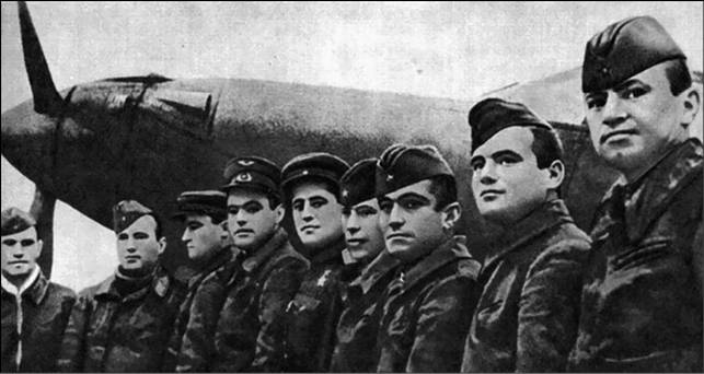 Герои Советского Союза 9-го ГИАП. Слева направо: Александр Карасев, Владимир Лавриненков, Иван Королев, Аркадий Ковачевич, Анатолий Морозов, Алексей Алелюхин, Амет-Хан Султан, Иван Борисов, Павел Головачев
