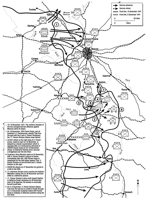 Топлива по-прежнему не хватало, поэтому самолеты Ju-52 сбрасывали контейнеры со снабжением, пролетая на высоте всего 15 метров, но часто контейнеры разлетались вдребезги, потому что земля все-таки подмерзла. В этот день Гитлер отдал приказ начать операцию по окружению Москвы, хотя сил у Группы армий «Центр» не осталось никаких. Гудериан должен был обойти Москву с юго-востока через Каширу, чтобы встретиться с 3-й танковой армией где-то около Ногинска. Однако 2-я танковая армия не могла сдвинуться с места, пока у нее как кость в горле стояла Тула.