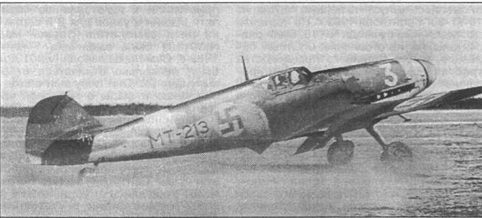 Взлетает Bf 109G-2 л-та Ээро Риихикаллио (Eero Riihikallio) из 2/HLeLv 24. На этой машине 17.06.1944 г. пилот сбил Ла-5, а 23.06.1944 г. - Ла-5 и Ил-4