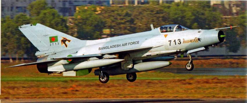 В 1978 г. из Китая и Пакистана начались поставки приблизительно четырех десятков фронтовых истребителей J-6 (китайский лицензионный вариант советского МиГ-19). Впрочем, эти сверхзвуковые самолеты 1-го поколения, выполненные на основе советской авиастроительной технологии 1950-х гг. и морально устаревшие еще в 1960-х гг., долго в бенгальской авиации не задержались и к настоящему времени уже сняты с вооружения.