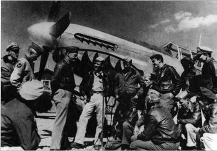 Клэр Ченнолт с летчиками американских ВВС у истребителя "Мустанг"