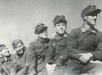 Слева на право: фельдфебели Эрнст Грауденц и стрелок его Ju87D (борт, код T6+EL) Йозеф Саутер, сбитые 8 октября 1942 г., следом три члена экипажа бомбардировщика Ju88A (борт, код V4+HS) из состава KG1, сбитые 21 октября 1942 г. (фото из архива Д.Карленко).