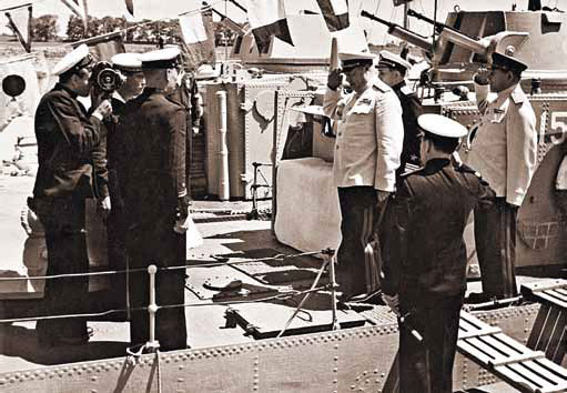 Прибытие маршала Толбухина на осмотр кораблей Дунайской военной флотилии. Австрия, Вена, май 1945 г.