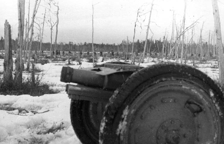 Второго сентября 1942 года дивизия прорывала блокаду в районе поселка Ивановское под Усть-Тосно, в так называемой Долине смерти. Мы заняли исходные позиции, пехота выкопала траншеи метрах в 100 от проволочных заграждений. До окопов противника оставалось 100–150 метров. Мы тоже подкатили свою пушку вплотную к пехоте. Саперы сняли минные поля. Наступление должно было начаться в 8 часов утра, пока туман еще не поднялся, после артподготовки, которая должна была длиться около двух часов. Не знаю, по какой причине, но артподготовка началась с опозданием на час-полтора. К этому времени туман поднялся, и немец, заметив сосредоточенную к атаке пехоту, открыл шквальный огонь. В траншеях кровь, мясо. Ужас! Мы два часа сидим, нас бьют. Когда прошла скомканная артподготовка, пехота пошла вперед, но потери в ее рядах уже были огромными. В итоге прорыва не получилось, и мы увязли в позиционных боях, продвигаясь в день на 200–300 метров. Местность полуболотистая, полупесчаная. Передвигались по-пластунски. Винтовки не стреляют – забиты песком и грязью. В долине стояло разбитое огромное серое бетонное здание, от которого тянулась железнодорожная насыпь. Пехота гранатами немцев закидает – они с этой насыпи скатываются, мы ее занимаем. У нас гранаты кончились, они нас сбрасывают. Эта насыпь неоднократно переходила из рук в руки. Потери огромные… Но полк наступал. На каком-то участке прорвались на километр, полтора. Пушку толкали прямо за боевыми порядками пехоты. Тут налетели Ю-87, бомба разорвалась у левого колеса орудия. В живых остался я, троих ранило, из них передвигаться мог только один, а остальные, в том числе и Саша Клевцов, погибли. В это время с правой стороны поднялась группа немцев, чтобы ударить во фланг роте, которую я поддерживал. Рота! Это мы сейчас большими категориями рассуждаем: армия, дивизия, полк, батальон. А у нас в батальоне оставалось 100 человек вместо 500, а в роте 20. У немцев тоже, наверное, рота поднялась, но и в ней было не более 30–50 солдат. Пушка моя – сзади. Что делать? У пушки были разбиты панорама и колесо, но стрелять она еще могла. Откуда-то взялись силы. Я пушку за хобот развернул, и мы эту пехоту уложили, выпустив по ней остаток снарядов, штук десять, наверное. Побили не всех, конечно, но главное, они от атаки отказались. Симоняк потом сказал: «Вот ведь Шишкин! Опять у него все получилось. Отбил атаку». А я потом сутки отлеживался, приходил в себя – меня знобило. Потом я принял вторую пушку, и с этой пушкой мы продвигались вперед. Ее тоже покалечило при бомбежке.