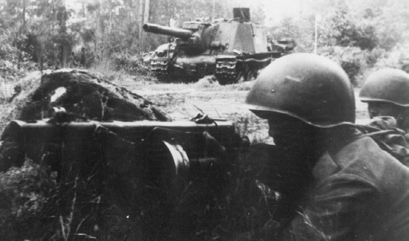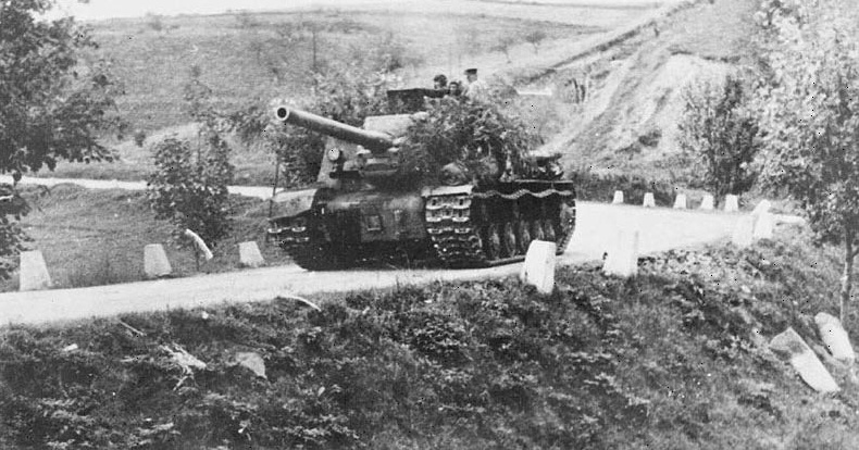 – Пулемета на ИСУ-152, к сожалению, не было. Хотя потом ДШК ставили, но моя батарея таких машин не получала. Это обстоятельство вынуждало нас приватно где-то добывать трофейный пулемет, и мы почти всегда его имели с запасом патронов. Он обычно лежал на броне в ящике. Вообще, помимо пулемета на крыше рубки всегда лежало 4–5 ящиков со снарядами. За рубкой стояла бочка с горючим. Машина шла к полю боя, всегда имея этот верблюжий горб. На исходных позициях мы горючее из бочки заправляли во внутренние баки и выкидывали.