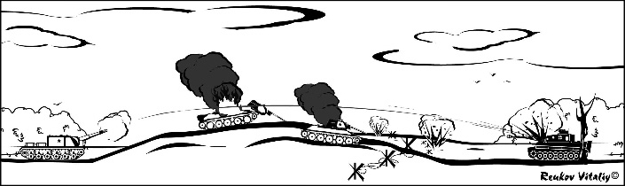 Первый бой мы приняли на реке Нугрь, за которой на крутом берегу виднелась деревня Большая Чернь, превращенная немцами в опорный пункт. Оттуда по наступающим по большому ржаному полю танкам и пехоте били 88-мм зенитки. В этой ржи не поймешь, откуда стреляют. Танки горят. Наводчик Бычков у меня был отличный. В этом бою он сжег два танка. В какой-то момент по нам попали. В рубке – искры, запах каленого металла, гарь. Механик-водитель Никонов бросил машину в низинку. Я вылез из люка, стал оглядываться. С трудом обнаружил противотанковую пушку на окраине поля в кустарнике. Мы вышли из ее сектора обстрела, и она теперь била по танкам. Я решил развернуться и, наведя орудие на ориентир в створе с пушкой, выкатиться на нее для выстрела. Если с первого выстрела не попадем – нам хана. Едва мы вышли из низинки, как пушка стала разворачиваться в нашу сторону. Бычков крикнул: «Выстрел!» – и одновременно раздался грохот. Я успел крикнуть: «Никонов! Назад!», но это было лишним – Бычков попал.