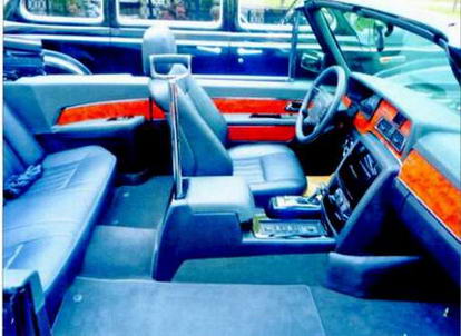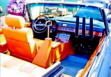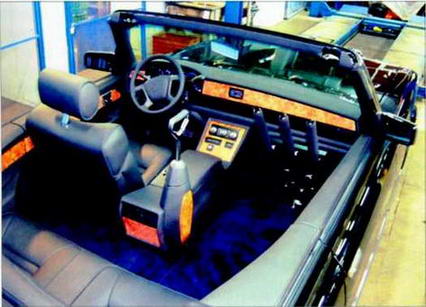 Зато интерьер машины изменился сильно. Щиток приборов с англоязычными обозначениями перекочевал с GMC Sierra. Оригинальная "баранка" имеет механизм пространственной регулировки, сиденья обтянуты кожей, однако салон оклеен специальной пленкой, всего лишь имитирующей дорогие породы дерева. Как того требует регламент, в салоне установлена тумба с поручнем, блок микрофонов и радиостанция. Только вернуть на прежнее место правое сиденье, как в зиловском образце, не получится. От легковушки Chrysler Concord заимствовали устройство для подъема и складывания тента. Громоздкость этого механизма превратило заднее трехместное сиденье в двухместное.