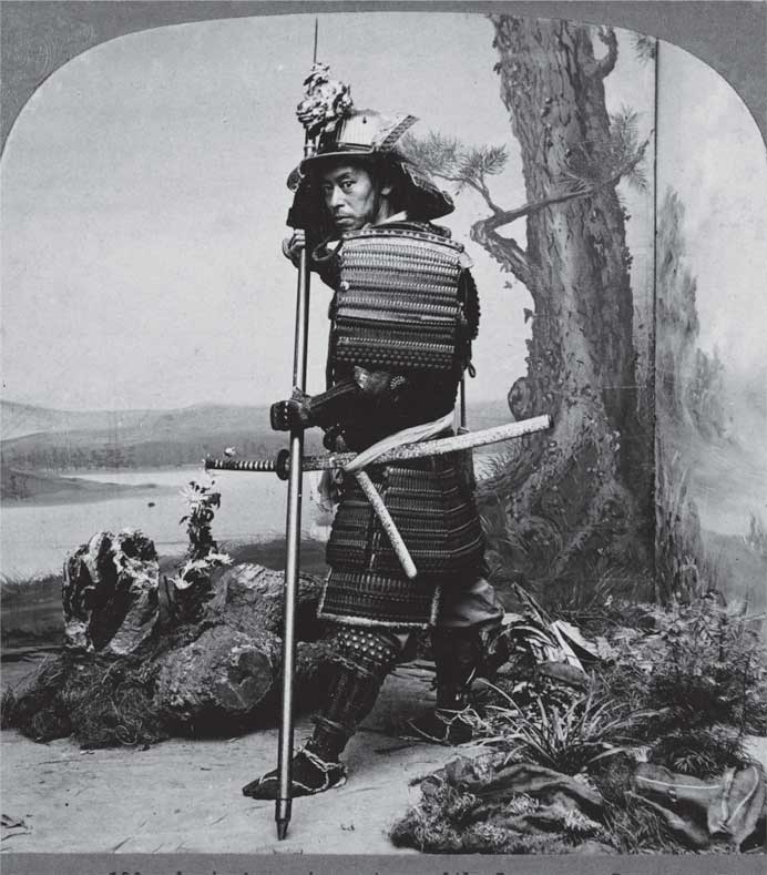 Японский воин XVI в. в соломенном плаще, вооруженный мечами и мотыгой