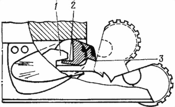 1 — зуб шептала; 2 — полочка уступа предохранителя; 3 — выступ предохранителя