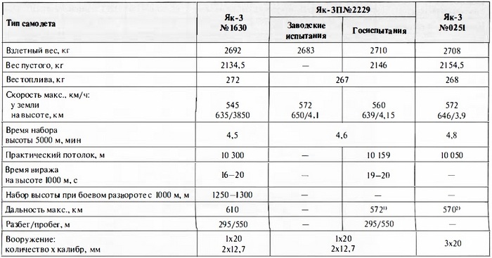 Основные данные серийных истребителей Як-3 с мотором ВК-105ПФ2