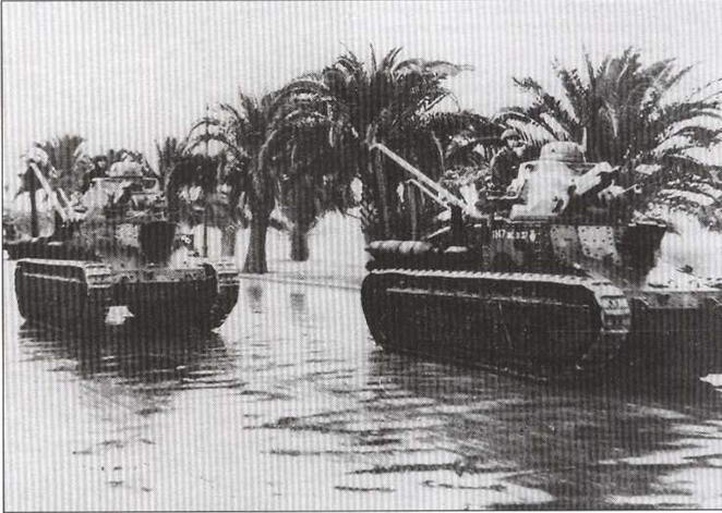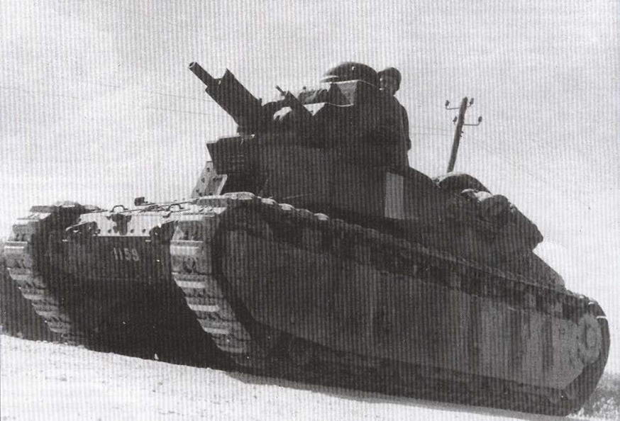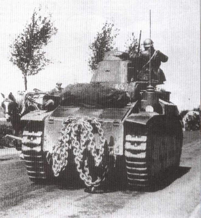 Танк D2 из состава 19-го танкового батальона 4-й DCR движется к линии фронта. Район Абвиля, 27 мая 1940 года. Обращает на себя внимание посадка командира машины в положении по-походному на откидной крышке кормового башенного люка. Во французских танковых войсках вместо буксирных тросов использовались цепи