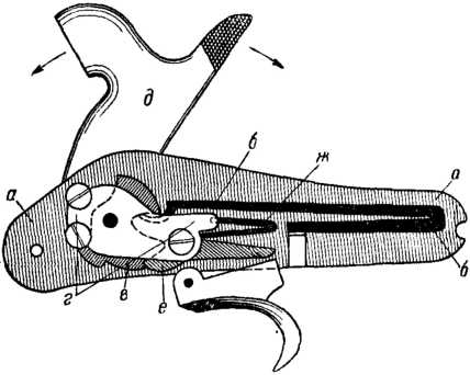 Ударный замок имел следующее устройство (рис. 49): на замочной доске а коротким своим концом была прикреплена боевая двухперая пружина б, соединенная длинным своим пером с лодыжкой в; к лодыжке, вращавшейся на оси, проходящей через замочную доску и накладку г, наглухо прикреплялся курок д; на лодыжке были взводы — боевой и предохранительный, в которые при взведенном курке и западало шептало спуска е, на него нажимала пружина ж, называвшаяся перкой; при нажатии на спусковой крючок шептало спуска выходило из взвода лодыжки, и последняя под действием боевой пружины вращалась вместе с курком, который разбивал капсюль.